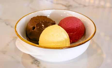 Yes, the desserts are back too, including Steve’s handmade ice cream and sorbets. The vanilla, raspberry, and cocoa flavors come from a recipe he learned from an award-winning French ice cream maker.