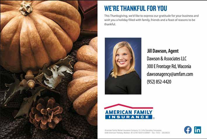 Our November issue is dedicated to stories of gathering, giving back, and celebrating the people and organizations that make Waconia such a special place. We’re endlessly thankful for our advertising partners, whose support allows us to bring inspiring stories to your doorstep each month, and for the readers who make it all worthwhile. The stickiness and togetherness of this community is truly inspiring.