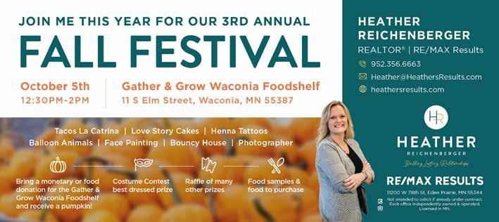 The 3rd Annual Heather Reichenberger with RE/MAX Results Annual Fall Festival is coming up next month on October 5! From 12:30-2pm at Gather & Grow Waconia Foodshelf, bring a food or monetary donation to get your holiday pumpkins! You’ll also enjoy a costume contest, balloon animals, face painting, bouncy house, henna tattoos, raffle with great prizes, and tasty food by Tacos La Catrina and Love Story Cakes.