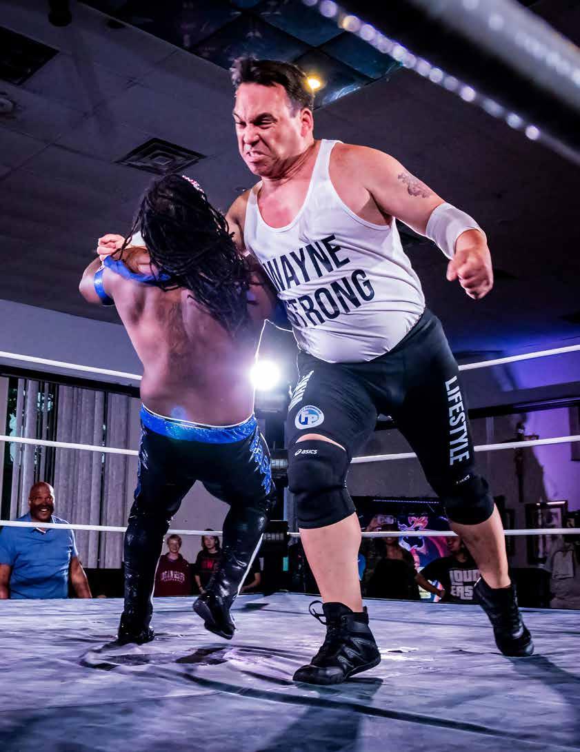 Phil wasn’t amused by the switch, yet he took it in stride, and prepared to face his new foe like a seasoned professional. His only armor he’d wear was provided by Fully Promoted in Clifton: Customized black and white Wayne Lifestyle wrestling shorts and the now legendary “Wayne Strong” tank top.
