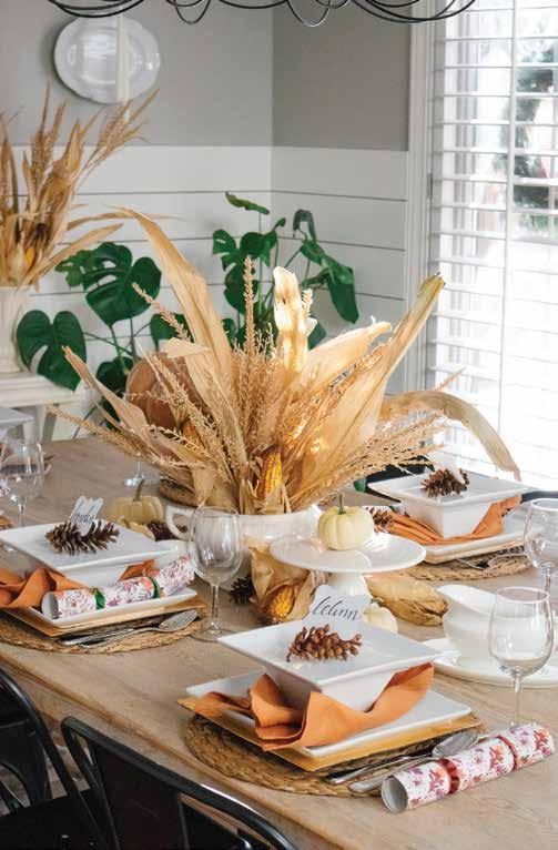 To create this cornhusk centerpiece, simply remove the dried tops of the cornstalks, arrange them in a vintage soup bowl adding a few ears of corn to give more stability and visual interest. Add preserved pinecones for guests’ place settings and you have the perfect touches for your table. Pinecone instructions can be found at SilvertoothHome.com/blog/pinecones-leaves