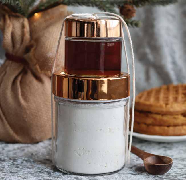 Include instructions to add water and bake (use amount and bake time as instructed on the package you purchased). Top with warmed maple syrup.