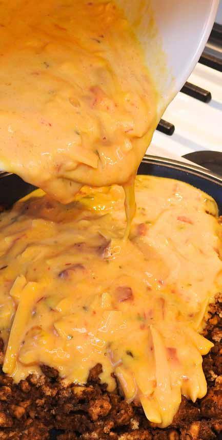 • Carefully pour the cheese and cream mixture over the top of the ground beef in the pie pan.