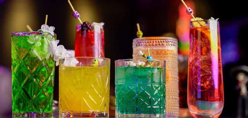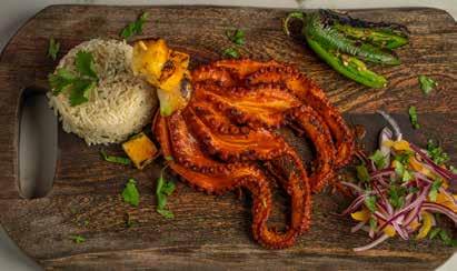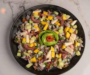 Top: Tamales Empanizados is a popular main entree of two deep-fried corn tamales filled with marinated pork + rajas con queso. | Bottom left: Pulpo al Pastor is a King Corona specialty dish of chargrilled octopus served with grilled pineapple, chambray onion, roasted jalapeno + arroz de coco. | Bottom right: Try the Ceviche Tropical, a traditional mix of of fresh shrimp, octopus + tilapia. | Next page: A stunning collection of King Corona’s festive cocktails mixed at its fully stocked bar.