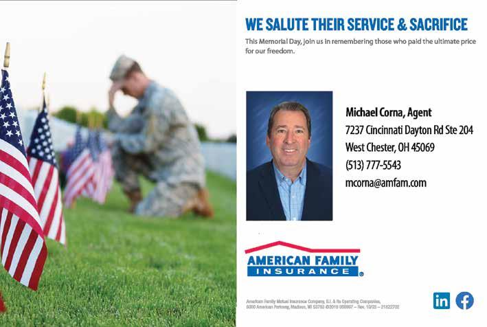 Serving families in the West Chester - Liberty Community for over 30 years at: 8310 Princeton Glendale Road, West Chester, OH 45069 Areas of practice include, but are not lim Wills DUI / Traffic Juvenile Criminal Defense Probate Financial / Estate Plan Divorce / Family Law Business & Real Estate Auto / Personal Injury Medical Malpractice Do YOU have a will? 513-777-2222 LyonsAndLyonsLaw.com @LyonsAndLyonsLaw 7996 Princeton Glendale Rd. Suite 101 • call or text 513-447-6448 • spengawestchester.com You’ll come for the WERKout, but stay for the community. Current Promotions: Unlimited sessions for $149/month with 3-month contract Unlimited sessions for $129/month for students with ID Discounts off our *standard rates* apply for Teachers, EMS, Fire, Police & Military with proof of ID. 15 | CITYLIFESTYLE.COM/WESTCHESTERANDLIBERTY MAY 2024
