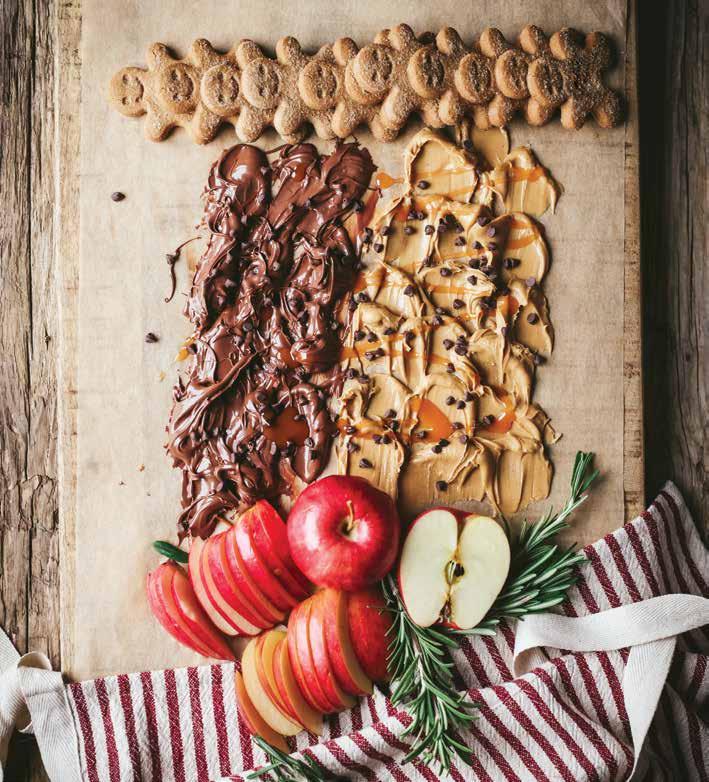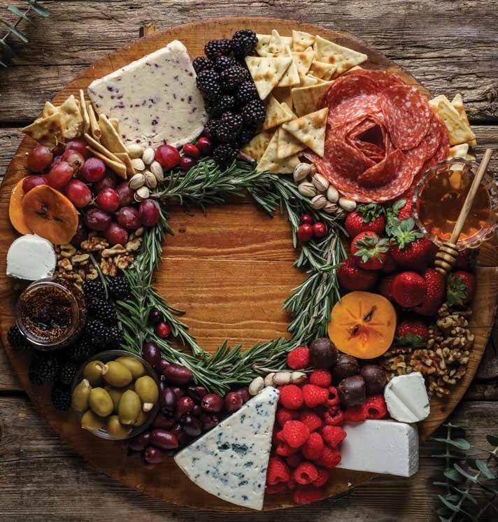 Place the jars of sauces and olives on the board first. Next place the cheeses on opposing sides. Add meats and fruits next. Layer in crackers, nuts and seeds and fill in any spots with extra nuts. Use fresh Rosemary or fresh greenery to add wreath accent in the center of the charcuterie board. Garnish with fresh cranberries. CONTINUED >