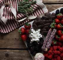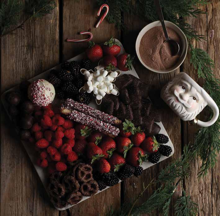 Place your favorite holiday cookie cutter on the board first. Fill the cookie cutter with mini marshmallows. Next, layer the large items first. Begin with the chocolate covered Biscotti and build around that using berries. Pile the berries high. Next add a variety of chocolate covered treats on opposite sides of each other between the mounds of berries. Be sure to add touches of berries around the edges. If space allows, place hot cocoa on board. Otherwise, set bowl full of hot cocoa mix and any additional hot cocoa fixings adjacent to the board.