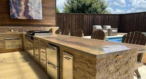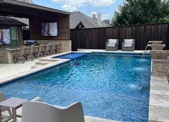Turn your backyard into a private paradise with a custom pool, complete with water features, an in-water table and seating area, a relaxing tanning ledge, and a massive outdoor kitchen with bar seating and solid roof cover for year-round entertaining.