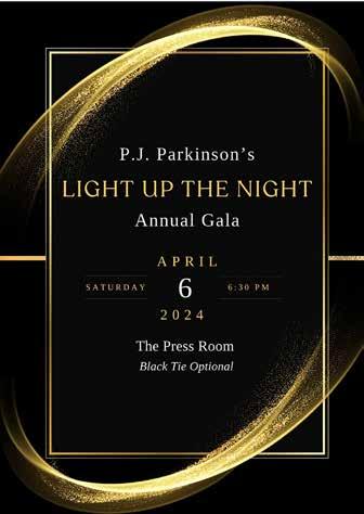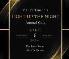 Light Up the Night for Parkinson’s hosts the 2024 annual gala, on April 6 at 6:30 p.m. at The Press Room. The event will have a cocktail hour, dinner, silent auction, live auction, and live entertainment. Black tie optional. Proceeds benefit PJ Parkinson’s, where the mission is to make life better for families affected by Parkinson’s Disease here in Tennessee and around the world. For more information, visit www.PJParkinsons.org