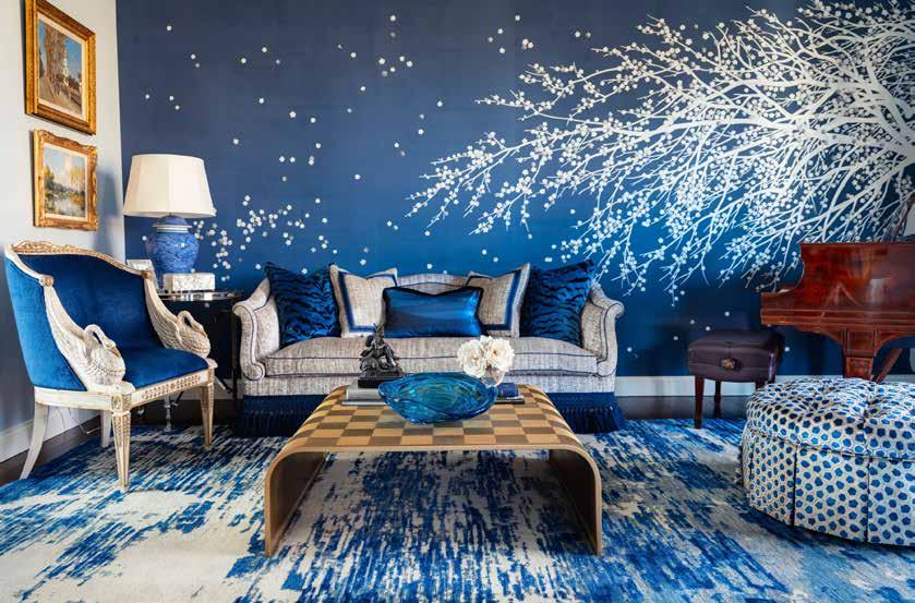 Today, this space is draped in shades of navy, cobalt, royal and silver blue, with a touch of aqua in a chandelier, and gold trim and hardware. The client already had a collection of antique pieces and accessories, so Todd’s team completed the look with new upholstery, drapes, and de Gournay hand-painted wallpaper.