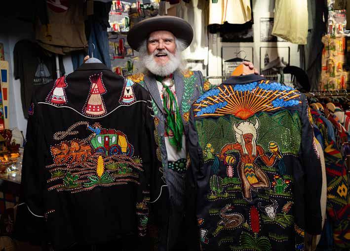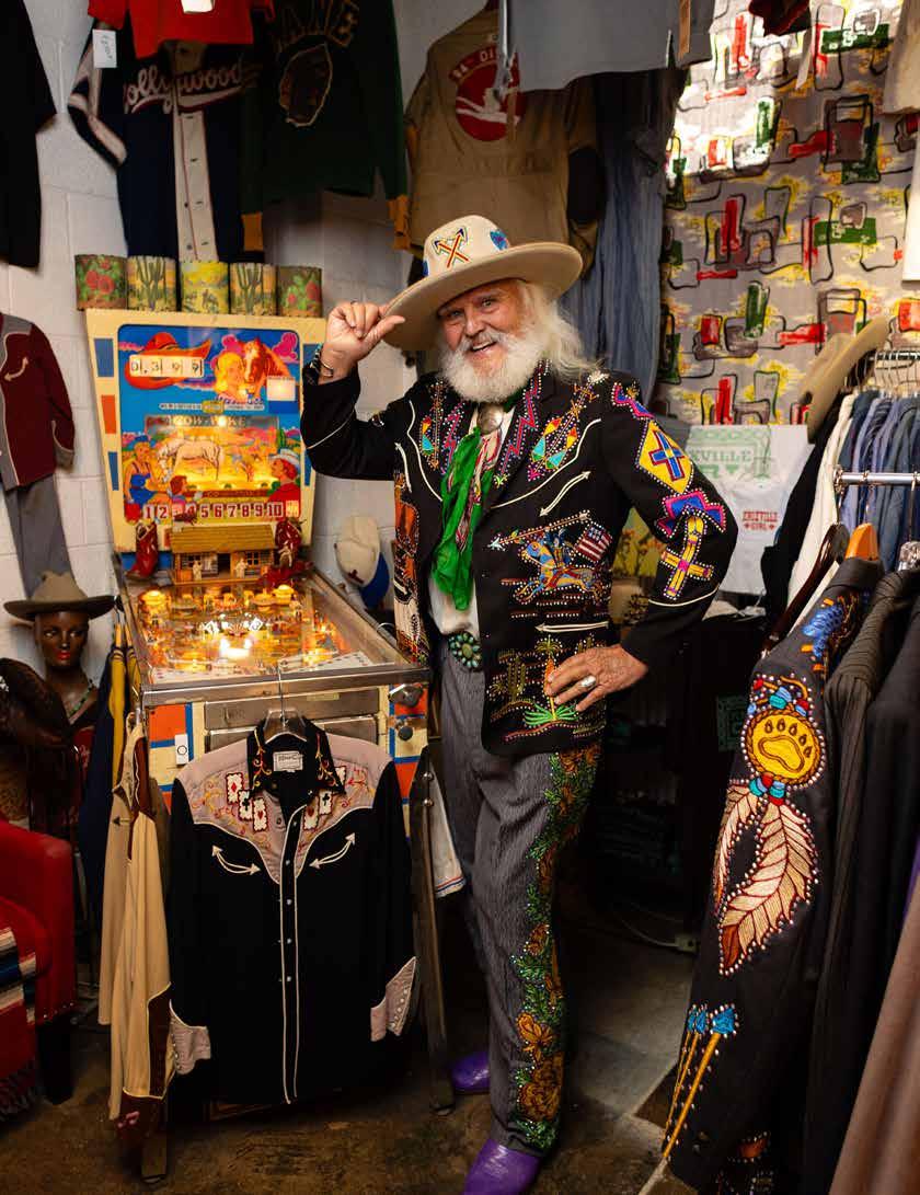 Standing 6-foot-2, Cowboy Phil is truly one of a kind. With his long white hair and easy, wide smile, he exudes a warmth that draws people in. Backed by decades of expertise in vintage Western culture, he greets visitors with genuine hospitality, inviting them to explore his carefully curated collection while sharing its rich history. It’s no wonder famous musicians seek him out to add one-of-a-kind pieces to their wardrobes.