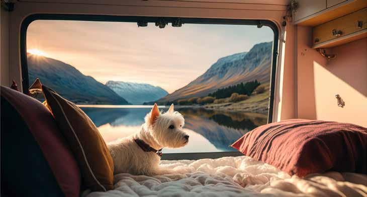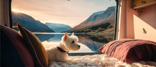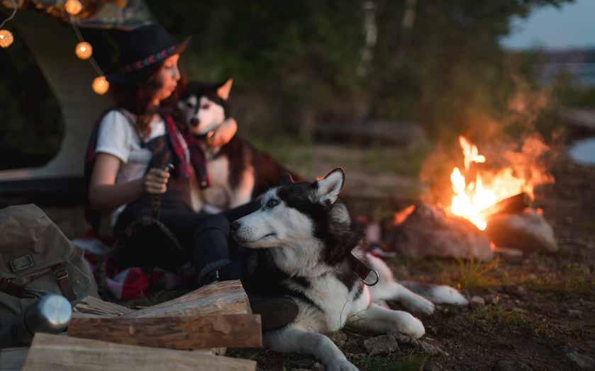 WHILE YOU’RE THERE . Respect other pets and campers. Don’t let your dog approach others without consent first. Pick up after your dog using earth-friendly waste bags, and dispose of responsibly. Apply pet sunscreen on nose and ears. Check paws for debris after each walk. Create a quiet place inside your tent or camper and play soothing music at night.