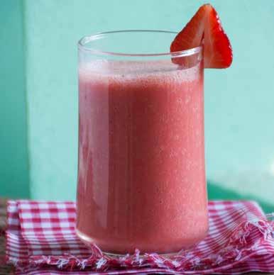 In a blender, add all ingredients and blend for 1–2 minutes, adding more milk/juice if too thick, until all ingredients are smoothly pureed and blended. Garnish with a fresh strawberry, and add a paper cocktail umbrella, if desired. Makes two large or four small servings.