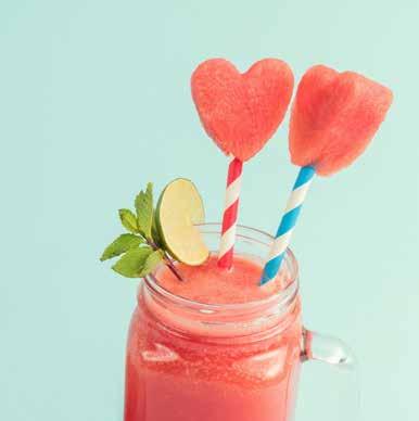 In a blender, add all ingredients and blend for 1–2 minutes, adding more juice if too thick, until all ingredients are smoothly pureed and blended. Garnish with watermelon shapes cut with mini cookie cutters on a decorative paper straw, if desired. Makes two large or four small servings.