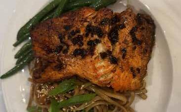 Fresh Atlantic salmon grilled and topped with our house bourbon soy glaze. Served with Asian noodles and fresh vegetables.