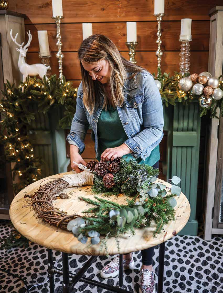 Continue adding fresh green clusters going down your wreath and slightly alternating the angle the greens are pointing. Finish your final cluster and give yourself 3-4” of additional wire to twist close at the back of the wreath to finish and secure.