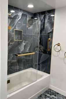 “I encouraged our children to pick their bedroom paint colors by choosing something from their closet that they love to wear. Their retro bath is black with a classic subway shower, diner-inspired flooring and a giant soaking tub. The girls have a warm white and gold bath.”