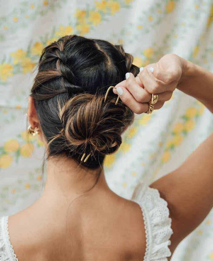 Part the hair down the center or side part, if preferred. Create braid(s) on the side of the head and secure with elastic. Twist the hair with braids into a simple bun, securing it with hair pins. Add an accessory for a classy touch.