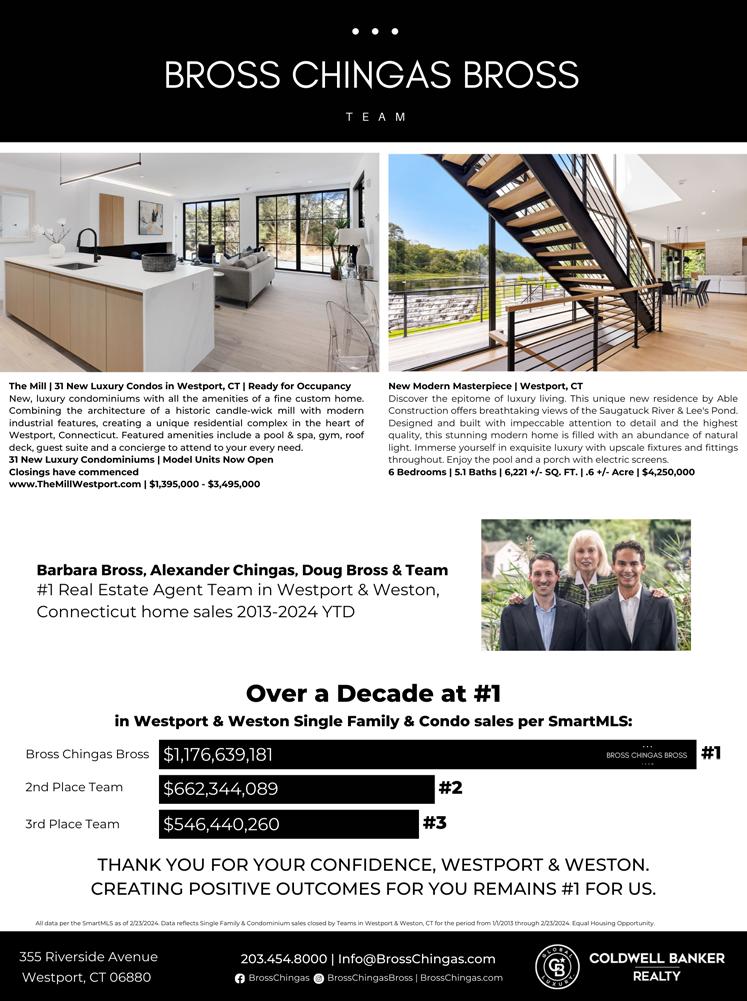 The Bross Chingas Bross Team is the #1 Coldwell Banker Realty Team in Connecticut. Sales associates Barbara Bross, Alexander Chingas, Doug Bross and their team members have ranked #1 Real Estate Agent Team in Westport and Weston, Connecticut out of all agent teams at all brokerage firms 2013-2024 year to date*.