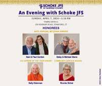 Schoke JFS (Jewish Family Services) of Fairfield County hosts their annual fundraiser event. This year's honorees include Nan and Paul Gordon, Betsy and Michael Stone, Sally Kleinman, and Ronnie Sichel. Tickets include a cocktail reception, dinner, and dessert. Tickets start at $250. Register at schokejfs2024.givesmart.com.