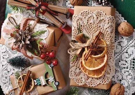 For gifts with a rustic, organic feel, use seasonal accents, such as sprigs, pine cones and cinnamon sticks, tied up with twine, encircling recycled paper for the wrapping.
