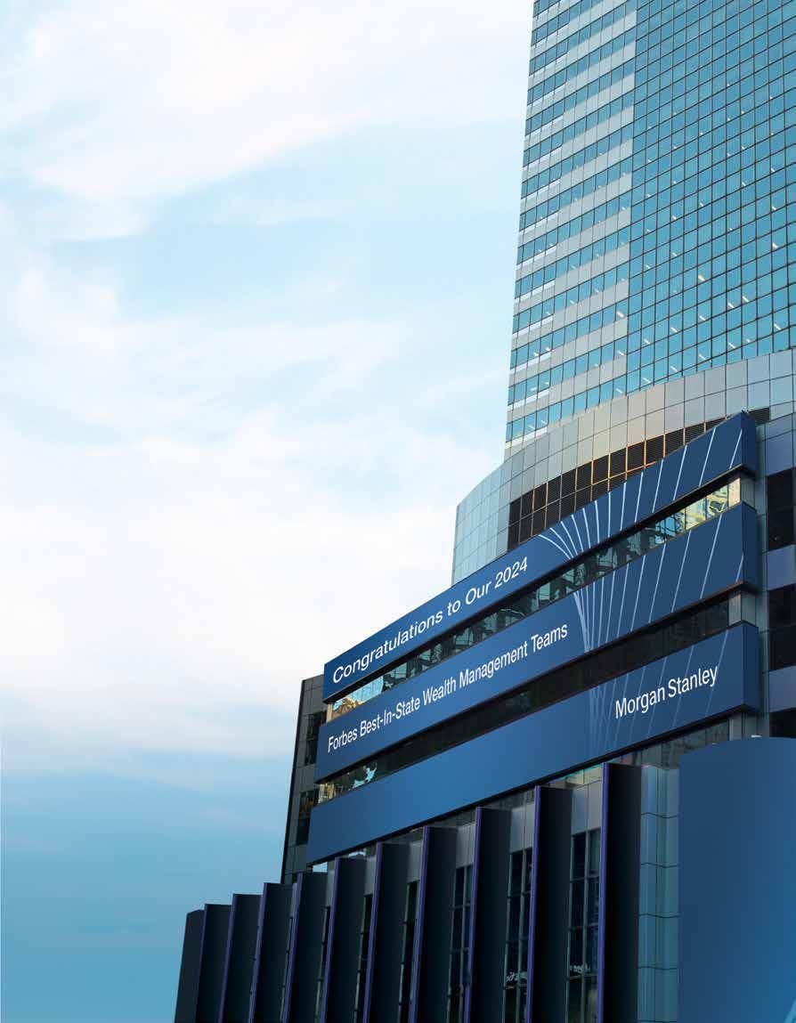 Source: Forbes.com (Jan 2024) 2024 Forbes Best-In-State Wealth Management Teams ranking awarded in 2024. This ranking was determined based on an evaluation process conducted by SHOOK Research LLC (the research company) in partnership with Forbes (the publisher) during the period from 3/31/22 – 3/31/23. Neither Morgan Stanley Smith Barney LLC nor its Financial Advisors or Private Wealth Advisors paid a fee to SHOOK Research LLC for placement on its rankings. This ranking is based on in-person and telephone due diligence meetings to evaluate each Financial Advisor qualitatively, a major component of a ranking algorithm that includes client retention, industry experience, review of compliance records, firm nominations, and quantitative criteria, including assets under management and revenue generated for their firms. Investment performance is not a criterion. Rankings are based on the opinions of SHOOK Research LLC and may not be representative of any one client’s experience; investors must carefully choose the right Financial Advisor or team for their own situation and perform their own due diligence. This ranking is not indicative of the Financial Advisor’s future performance. Morgan Stanley Smith Barney LLC is not affiliated with SHOOK Research LLC or Forbes. For more information, see www.SHOOKresearch.com.