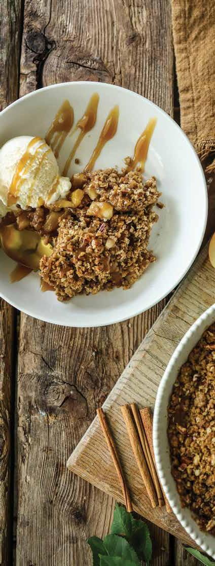 Preheat oven to 375 degrees. Lightly grease pie plate or baking dish. Mix all filling ingredients together and place in baking dish. Prepare topping by combining the flour, brown sugar and cinnamon in a bowl. Cut in butter using a fork or pastry cutter. Stir in oats and pecans and sprinkle over filling until covered. Bake for 45 minutes and serve with caramel drizzle and vanilla ice cream.