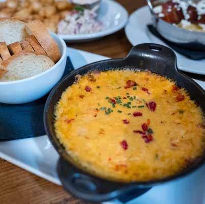 Pimento Cheese, the iconic Southern spread. Fire roasted jalapeño, cheddar, cream cheese and chives served with crispy crostini create pimento cheese perfection.