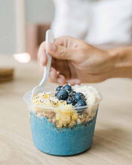 Eden’s smoothies are perfect for a post-workout snack or an afternoon pick-me-up. Their menu includes refreshing, healthy options made with organic fruits and veggies. Our pick to give us that muchneeded energy boost is the Eden Smoothie Bowl. Enjoy layers of banana, pineapple, almond milk and blue spirulina topped with granola, blueberry, pineapple, shredded coconut, chia seeds and honey.