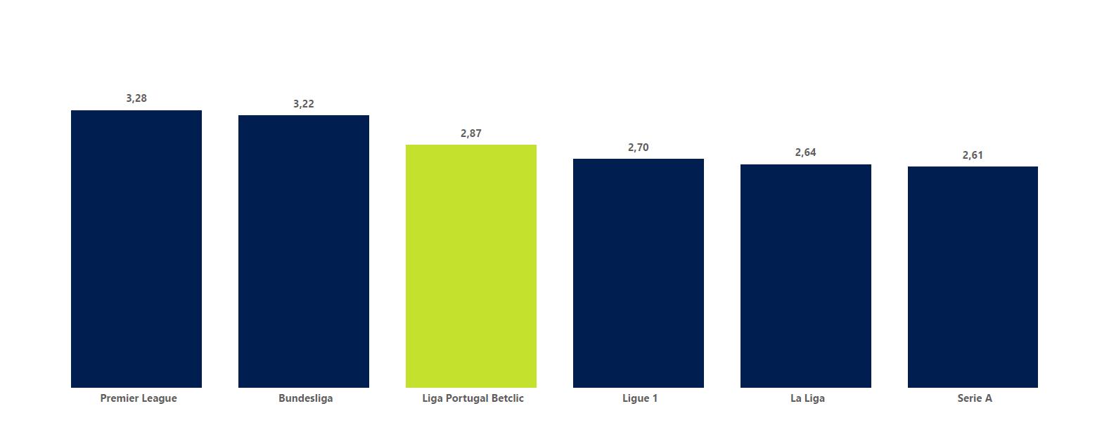 ALigaPortugalBetclicapresentaumamédiade 2,87golosporjogo.ComparandocomasBig-5, vemosqueapenasaPremierLeagueea Bundesligatêmmelhorregisto.