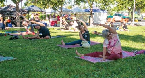 ABOVE purchasing pickles at the Yellow Green Farmers Market in Hollywood Andrew Itkoff for Lighthouse Point magazine LEFT TOP yoga on the lawn at the Pompano Beach Green Market LEFT BOTTOM Pompano Beach Green Market Jeff Graves for Lighthouse Point magazine