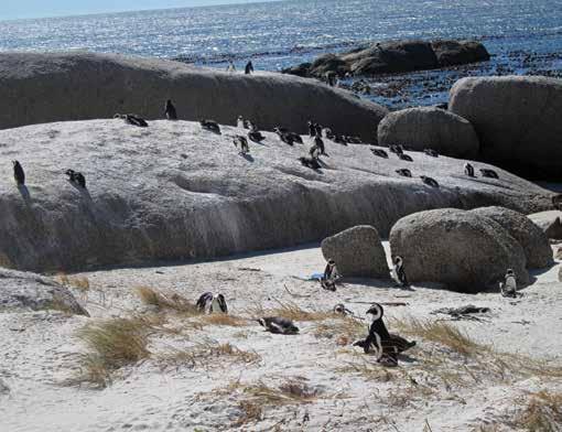 Nestled in a cove nearby is a thriving breeding colony of African Penguins. Actually in the midst of a residential area, there is a long boardwalk at Foxy Bay for close-range viewing. The birds wander freely around and under it in a protected natural environment. These penguins have often been called Jackass Penguins due to their braying call similar to that of a donkey.