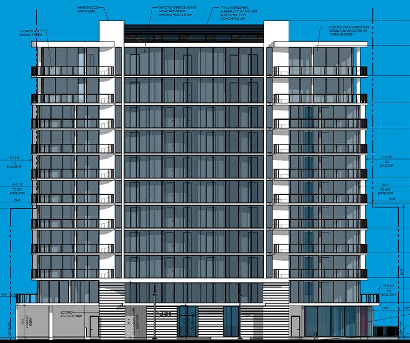At the southwest corner of the building, there would be 878 square feet of ground-floor commercial space facing Briny Avenue. The ground floor would also include a 5,380-square-foot lobby with amenities, as well as a pool deck overlooking the ocean.