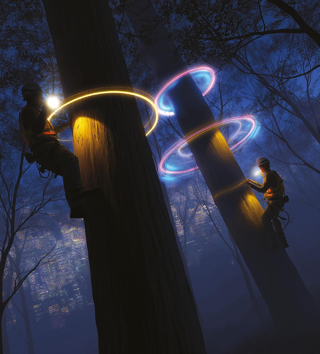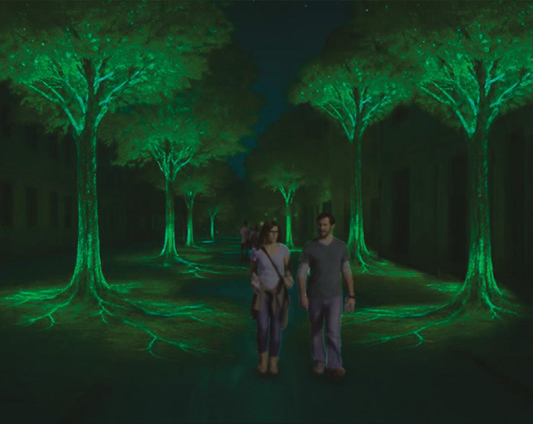 Des arbres bioluminescents éclairent la ville. La sous-face des feuilles modifiées s’illumine au passage des piétons et des véhicules, guidés par des racines intelligentes détectant mouvements et vibrations. La lumière douce, autonome et écologique, réduit la pollution lumineuse et recrée un lien poétique entre humains et nature. La ville s’affranchit des lampadaires énergivores. Le concepteur lumière devient chorégraphe du vivant.