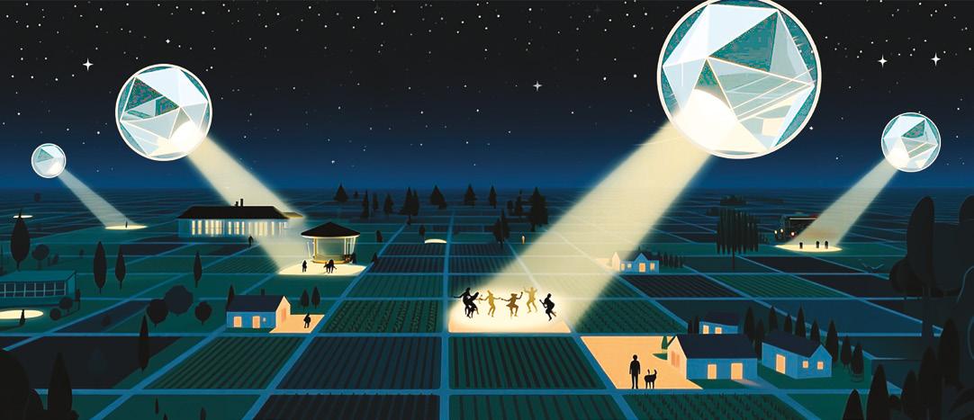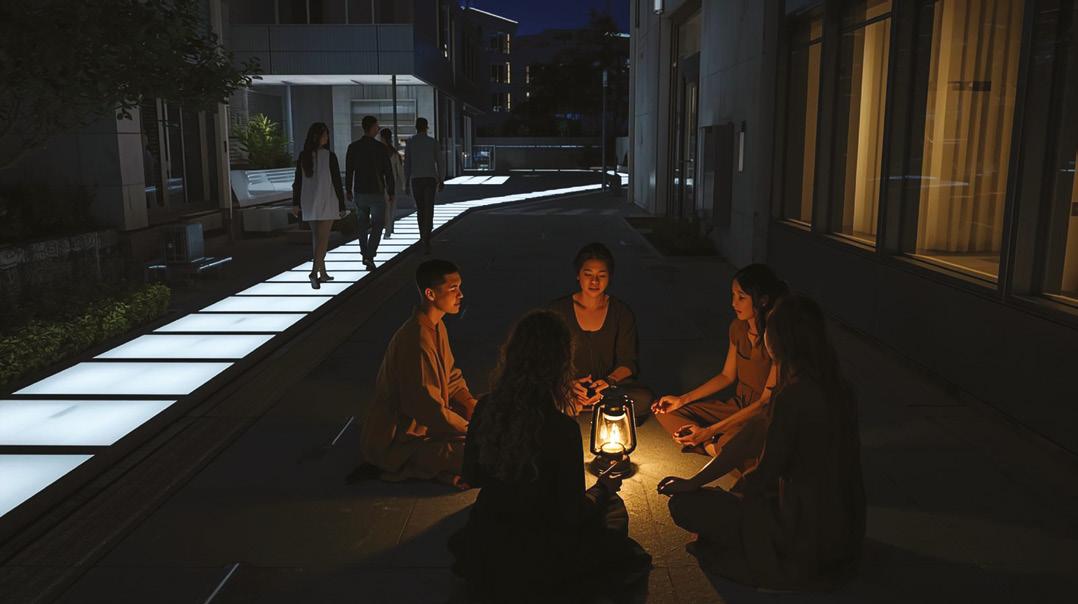 Dans un futur marqué par des crises climatiques et des dérives politiques, la « trame rose » émerge pour réenchanter la nuit et recréer du lien social. Artistes, chercheurs et citoyens imaginent des lumières festives, des transports sensoriels et des jeux énergétiques, mêlant technologie, écologie et convivialité pour repenser l’usage de la lumière et revitaliser les écosystèmes.