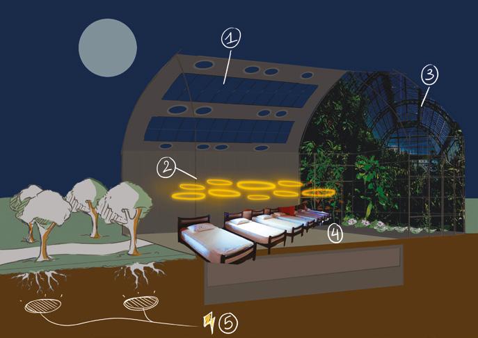 Bioluminescent trees illuminate the city. The underside of modified leaves lights up as pedestrians and vehicles pass by, guided by intelligent roots that detect movement and vibrations. Soft, autonomous, and ecofriendly lighting reduces light pollution and recreates a poetic link between humans and nature. The city frees itself from energyintensive streetlights. The lighting designer becomes a choreographer of life.