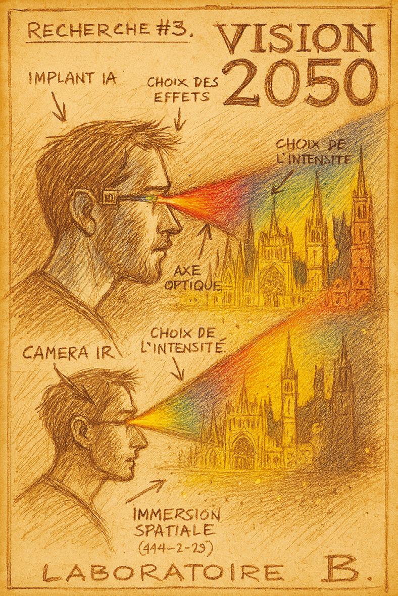 Un collyre high-tech à base de nanoparticules offre à l’humain une vision nocturne proche des félins, pendant 6 heures. Il exploite la lumière résiduelle, supprimant l’éclairage artificiel, réduisant la pollution lumineuse et valorisant la sobriété. En questionnant la nécessité même d’éclairer la nuit, ce collyre esquisse un futur où la technologie ne génère pas plus de lumière, mais au contraire nous rapproche de l’obscurité et de sa beauté préservée.