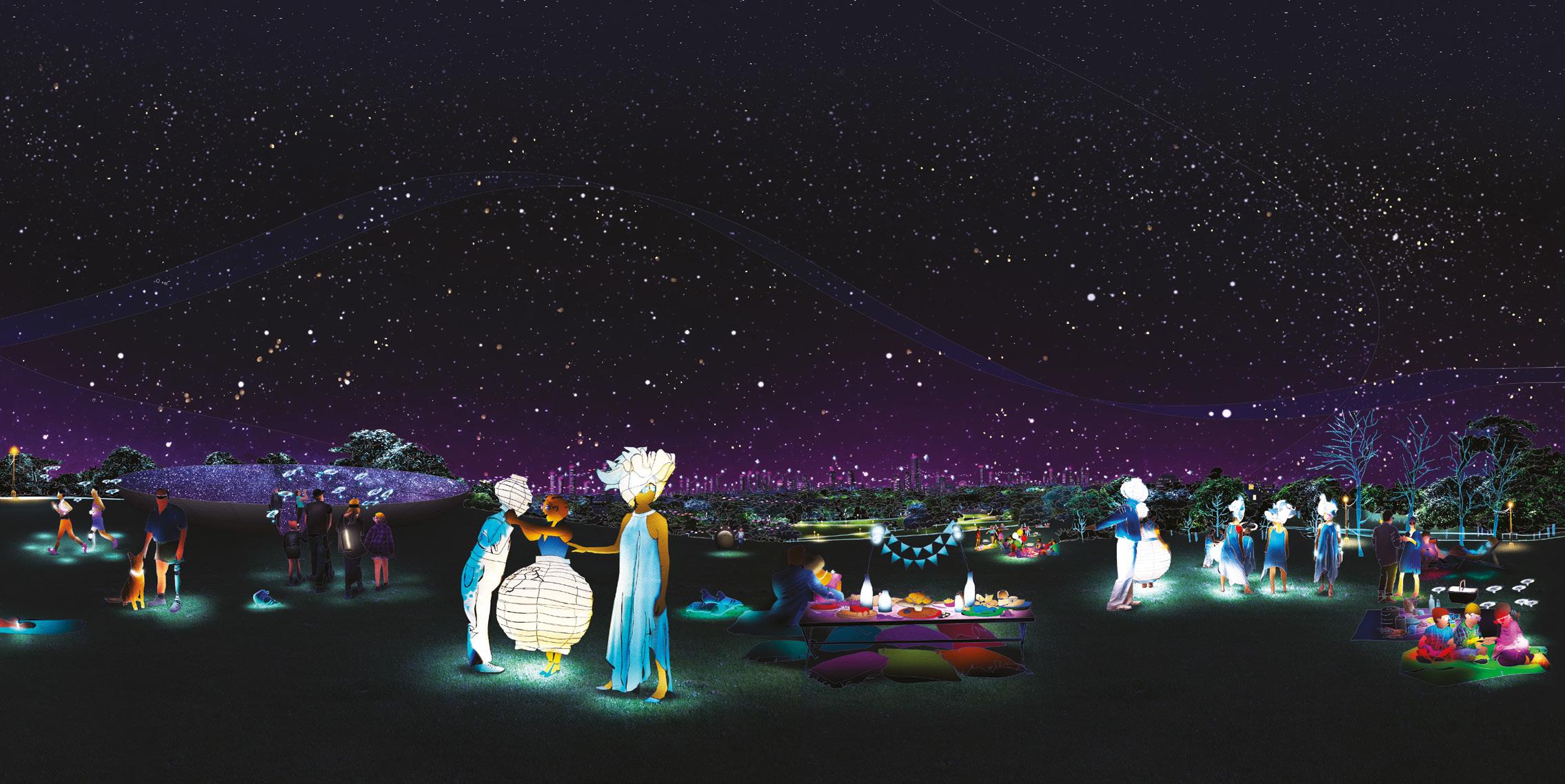 This tale recounts the journey of Light through three realms—the countryside, which preserves the night; the megalopolis, which is saturated with light; and the reversible city, which is ever-changing— to learn how to forge bonds, inspire, protect and sometimes disappear to make way for the shade. Light learns to be flexible, ephemeral and mobile, in order to forge bonds between humans, nature and shadow. By 2055, lighting has become an art form.
