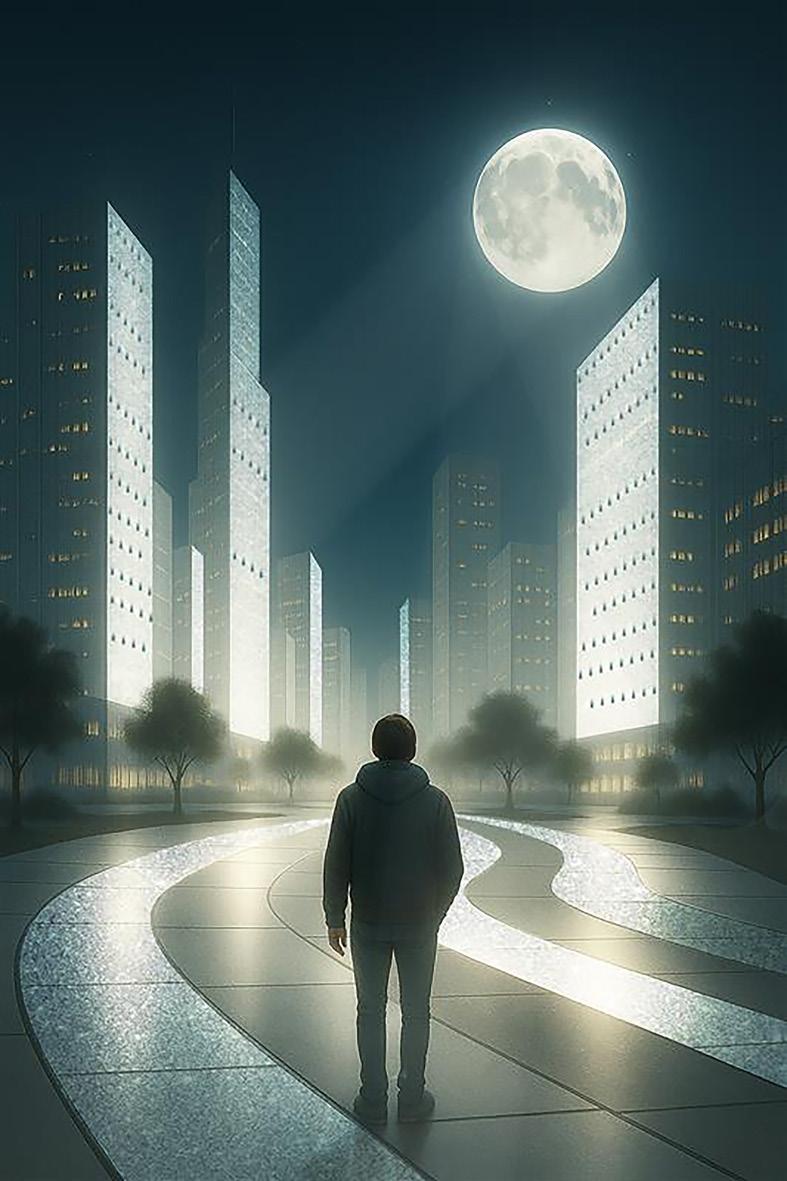 En 2050, l’humanité découvre son « résonateur intérieur », capable d’éveiller la lumière par la conscience. La nuit devient vivante, respirant au rythme des foules. Puis les émotions se révèlent en auras colorées : joie dorée, tristesse bleue, colère rouge, paix verte. Les masques tombent, les villes se transforment en symphonies lumineuses, et la lumière devient extension de la conscience.
