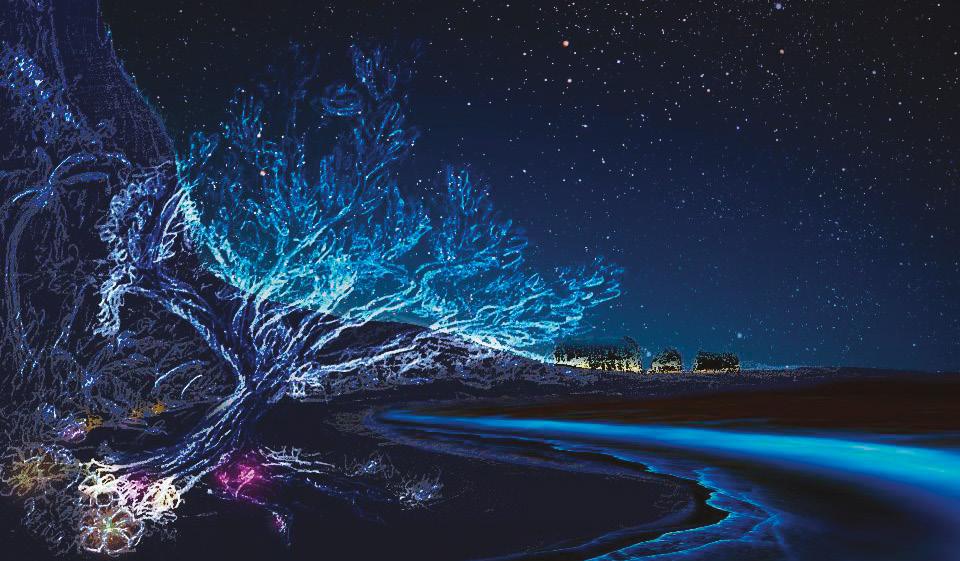 Te Lapa, a bioluminescent algae spawned by this climate catastrophe, invaded the ocean and became a source of light. Orbs of different sizes, containing bioluminescent seawater, light up walkways and houses, and the mother-of-pearl shells amplify the glow.