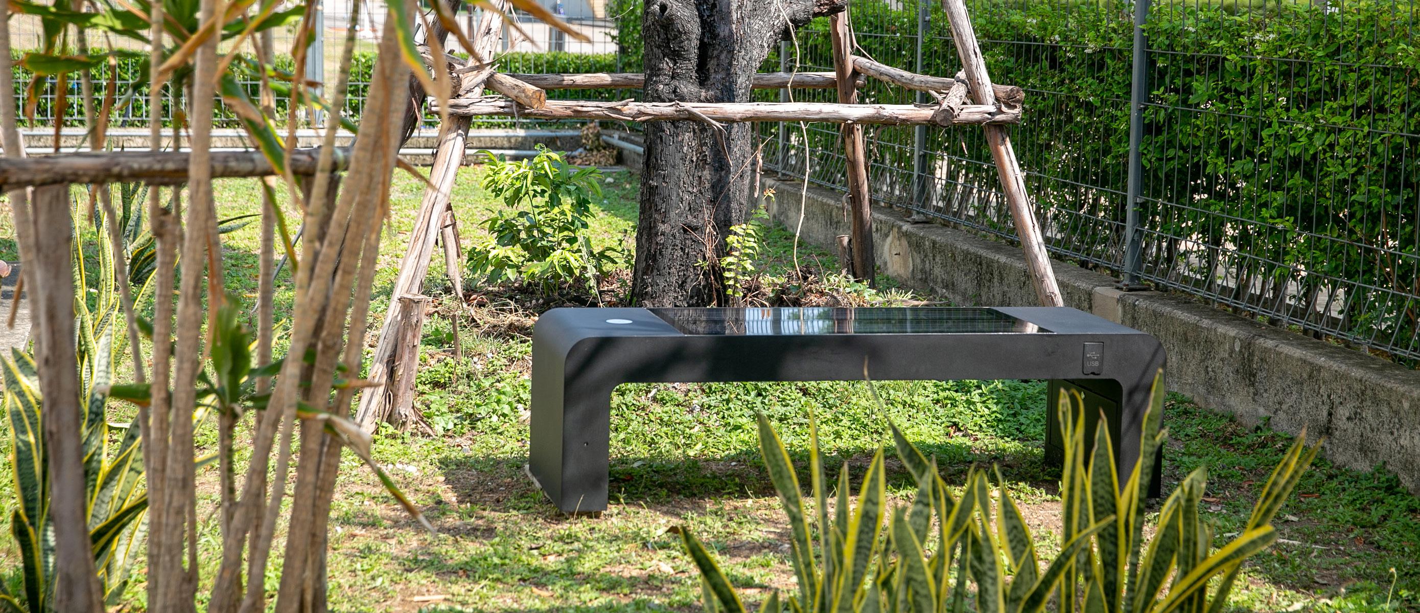 Combine différents éléments, généralement séparés, en une seule unité multifonctionnelle. Les bancs sont équipés de panneaux photovoltaïques intégrés qui génèrent de l'énergie pour l'éclairage RGB sous le banc, ainsi que des points de recharge USB et sans fil. Ce mobilier répond aux besoins évolutifs de l'environnement urbain moderne.