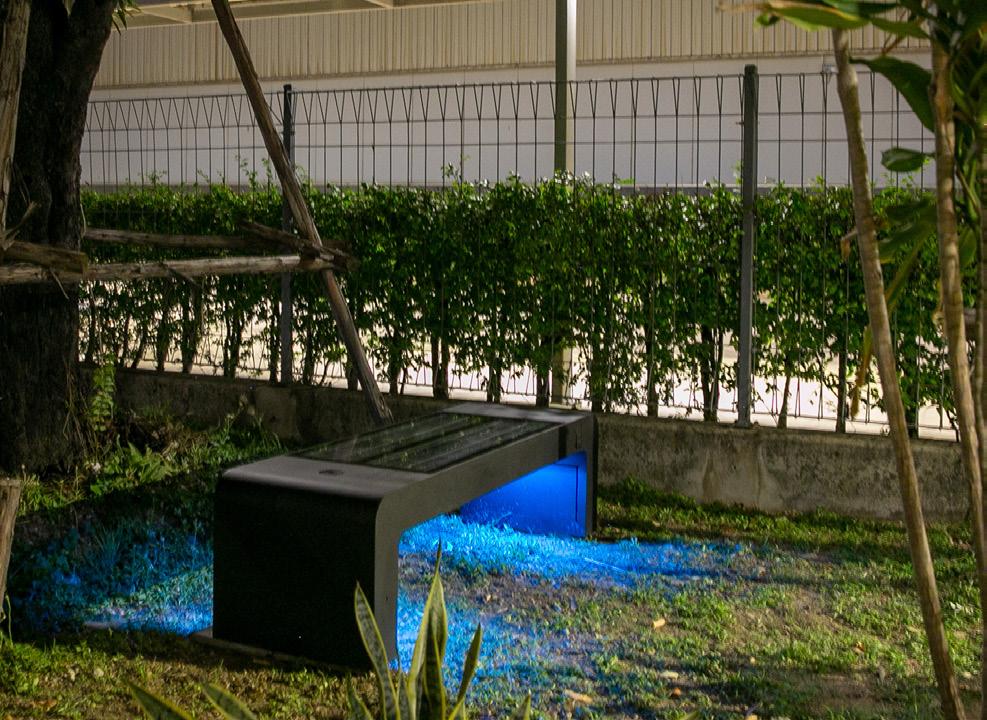 Multifunctional solar-powered urban lighting furniture. Bench integrated photovoltaic panels generate power for the under-bench RGB lighting, as well as USB and wireless charging points.