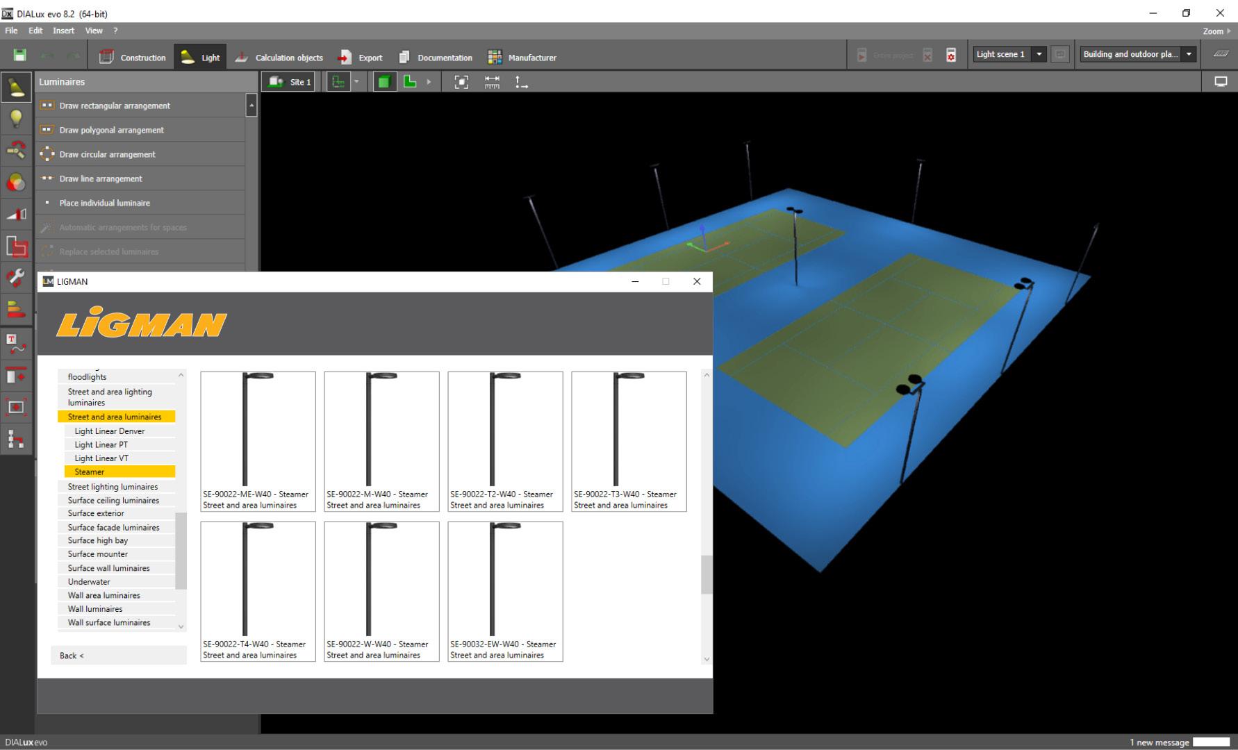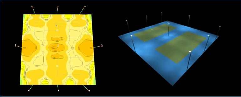 The following DIALux illuminance calculations analyse a standard metal halide flood light solution against two contemporary LED flood light options, and how they compare side by side when lighting single and twin outdoor tennis courts.