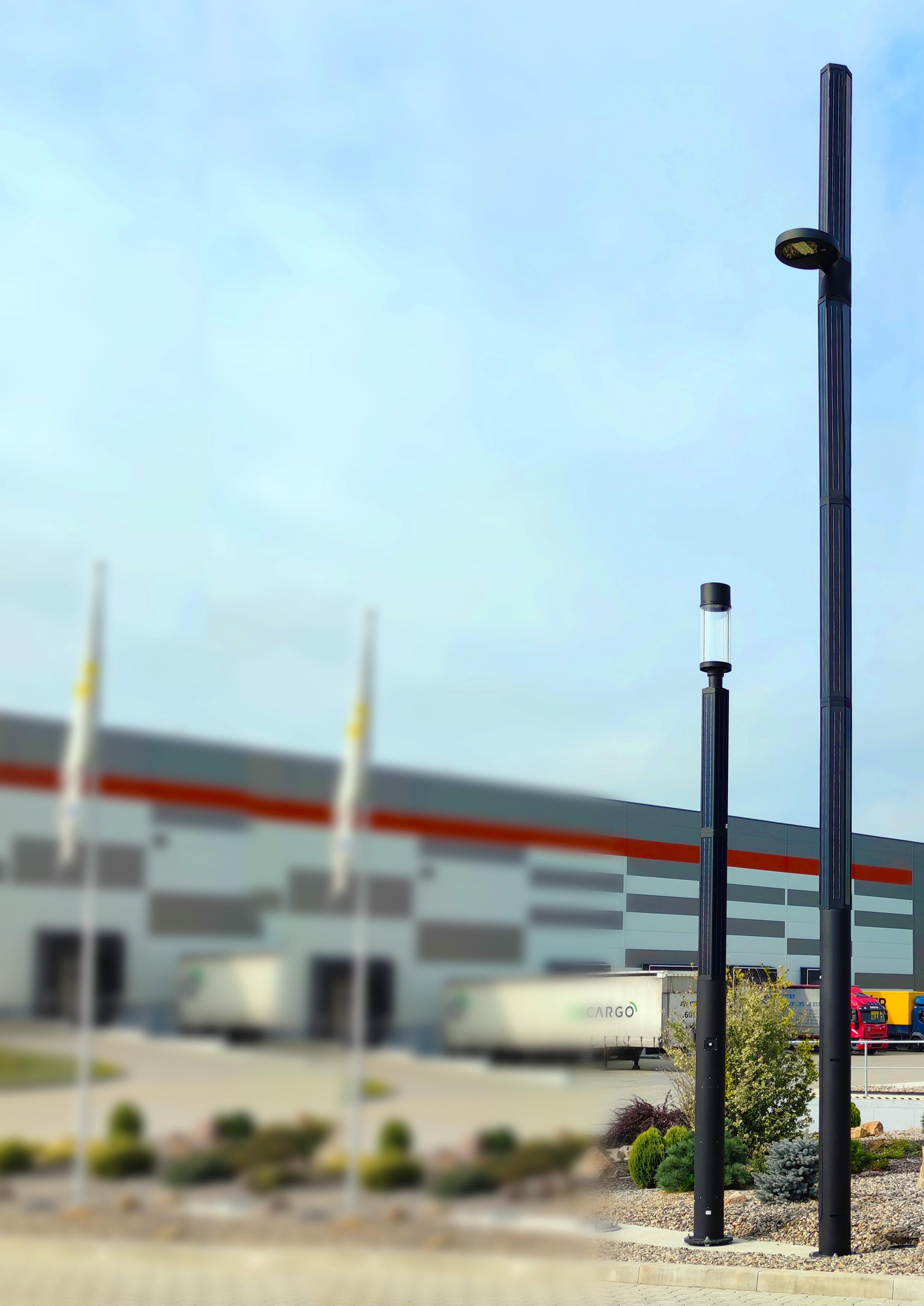 Des luminaires d’éclairage tête de mât urbain fabriqués spécifiquement pour être utilisés avec des mâts PV verticaux.