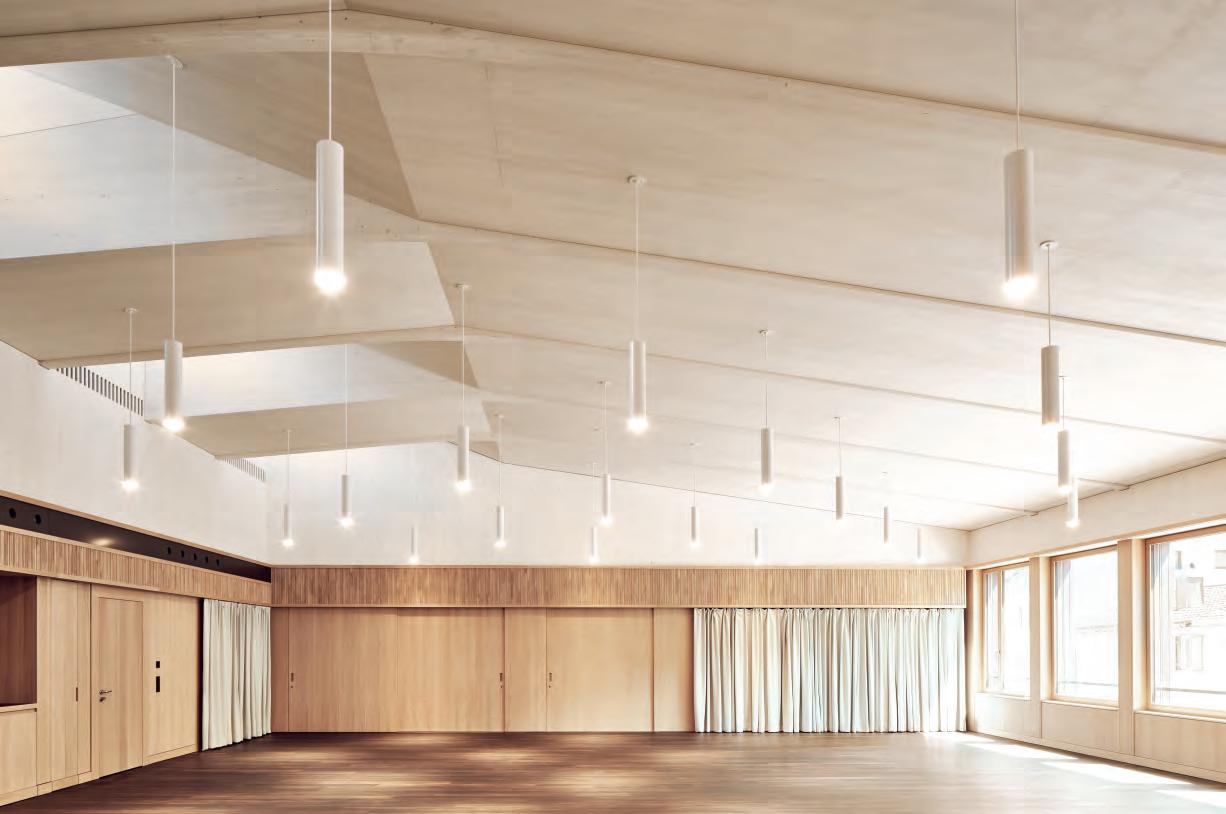 polyvalente dénommée ‹Löwensaal› qui, ne répondant plus aux impératifs actuels, a été démolie. Le réseau de chemins a été complété et prolongé par des murets enduits typiques de la région. Une rampe en pente douce et quelques marches mènent de la place du village existante à la nouvelle place de l’hôtel de ville. Avec sa façade en bois structurée de couleur bordeaux à pignons multiples qui l’inscrit subtilement dans son environnement urbain, la maison de la culture est l’aboutissement de cette nouvelle séquence spatiale. Les nouveaux bâtiments bordent la place de l’hôtel de ville dont les dalles en Verrucano de Mels entourent la zone pavée en pierre naturelle. Un jeu d’eau central, trois groupes d’arbres, des sièges accueillants et un éclairage d’ambiance animent et articulent la nouvelle place, en particulier lors des soirées festives. La façade à pignons de la maison de la culture délimite la place et souligne l’entrée principale du complexe culturel. L’auvent, à la manière d’un geste rassembleur, invite à une transition fluide vers l’intérieur et conduit les visiteurs dans le foyer multifonctionnel en forme de Z et qui borde la salle principale ayant repris le nom de ‹Löwensaal›. Celle-ci peut accueillir jusqu’à 744 personnes et est