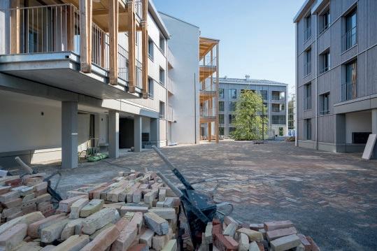 1 Un espace de vie de qualité pour plusieurs générations: La place du village de l’ensemble de logements Burkwil. Les briques proviennent d’un assainissement d’un centre-ville en Allemagne et retrouvent ici une seconde vie. Architecte Duplex Architekten AG, Zurich Maître d’ouvrage Stiftung Burkwil, Zoug Photo SJM Michael Trost