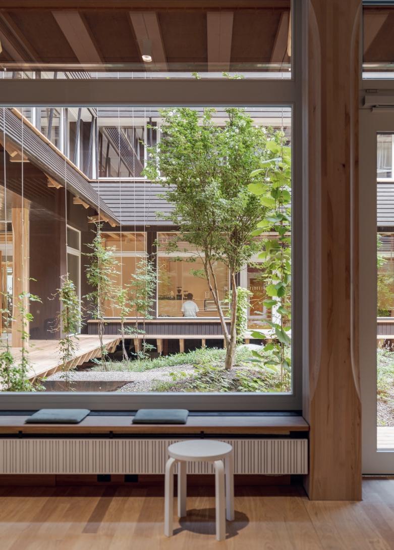 donne sur une cour intérieure végétalisée imaginée par l’architecte paysagiste Piet Oudolf. De hauts arbustes et des plantes vivaces bordent un sentier de gravier et des plantes grimpantes se hissent sur les façades. Ce jardin est irrigué par un réservoir d’eau de pluie, utilisé également pour les chasses d’eau. Une véranda couverte en bois complète cette cour par un espace de détente.