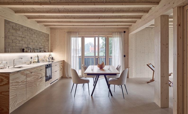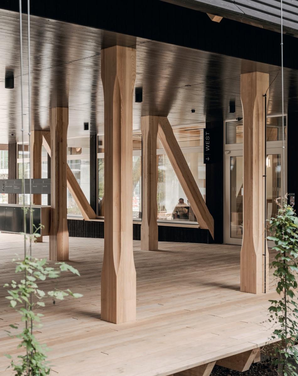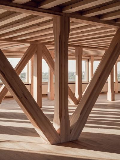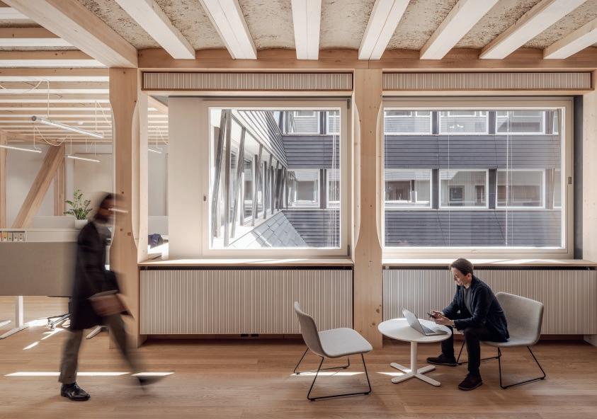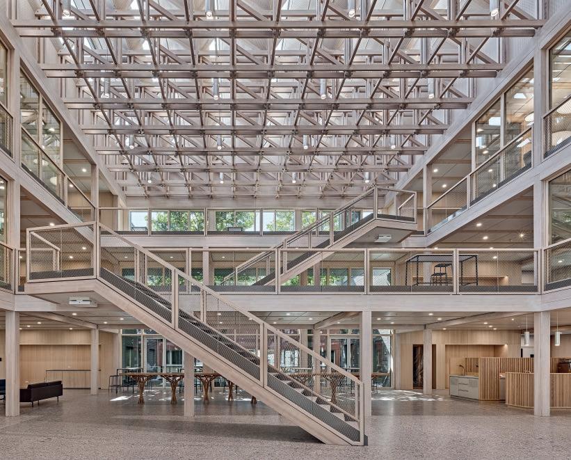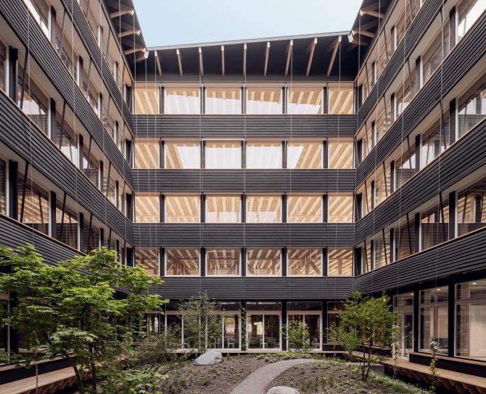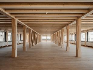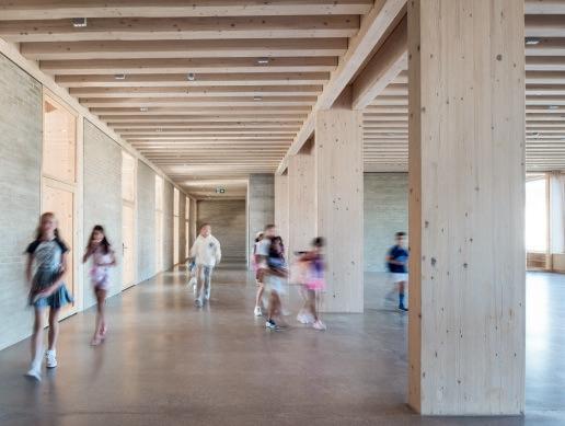 sur place avant d’être compacté sous forme de voûtains dans les modules de plancher, dont le bois provient de différentes forêts des environs. Ces éléments, mis au point avec les ingénieurs de ZPF, assurent une protection incendie, compensent les variations d’humidité et, grâce à leur capacité thermique, absorbent les excès de chaleur en été. A capacité portante comparable, la construction des planchers a généré dix fois moins d’émissions de CO2 que des éléments conventionnels.