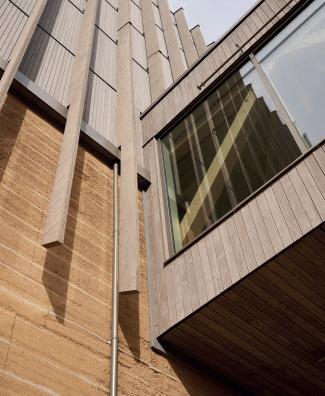 3 Le bois et l’argile à grande échelle: le nouvel entrepôt du centre logistique de Schwäbisch Gmünd en bois massif repose sur un mur en pisé de huit mètres de haut. Architecture Michelgroup GmbH, Ulm et Zurich Maître d’ouvrage Weleda Arlesheim, Suisse Photo Elias Hassos, © Michelgroup GmbH