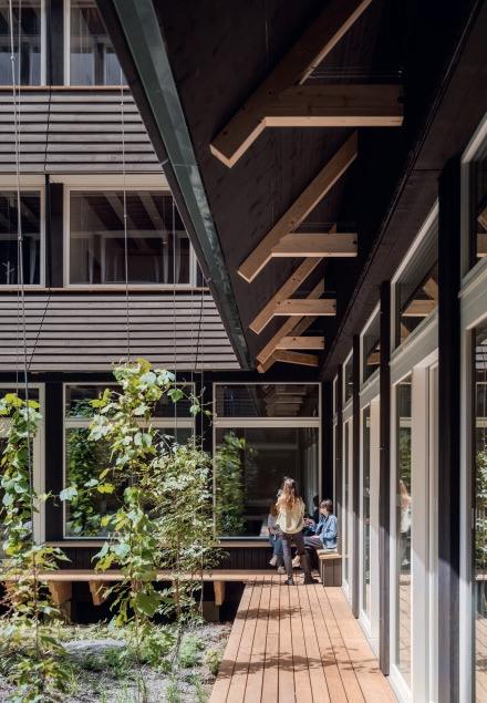 La réduction de l’empreinte carbone influence la conception: Hortus est une construction en structure bois de plusieurs étages avec des planchers intégrant de la terre battue, qui se présente comme un volume compact sans sous-sol autour d’un patio végétalisé.